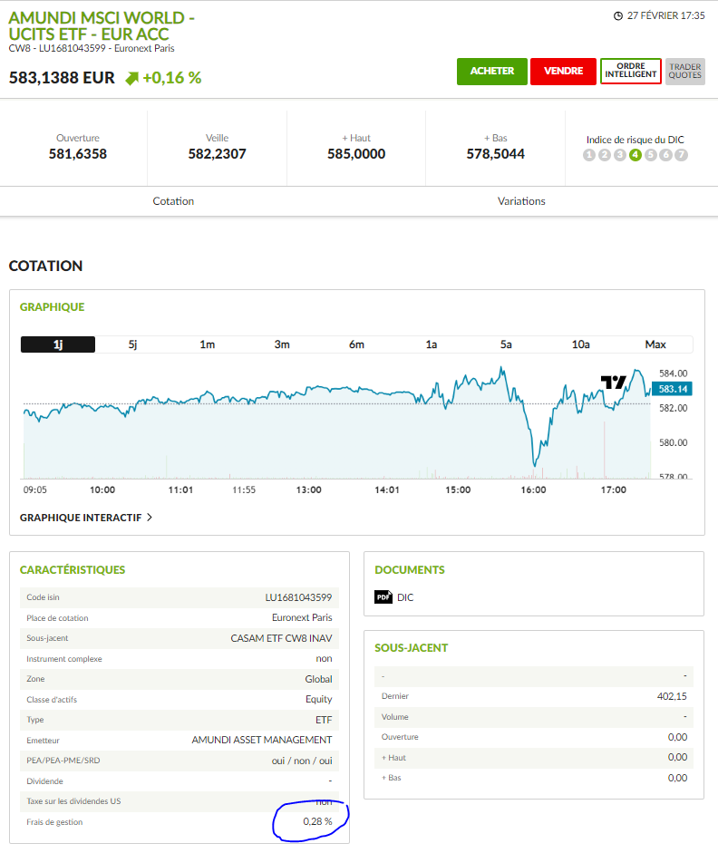 Jâai appelĂ© le service client, mais ils nâont pas su me dire pourquoi il y a Ă©crit 0,28% de frais de gestion quand le CW8 est normalement Ă 0,38%.