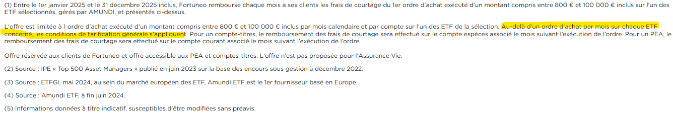 ** Fortuneo : en 2025, chaque mois le 1er ordre offert sur une sĂ©lection dâETF Amundi (pour un ordre dâachat compris entre 800 ⏠et 100 000 âŹ). offre mise en pause par Fortuneo en janvier."