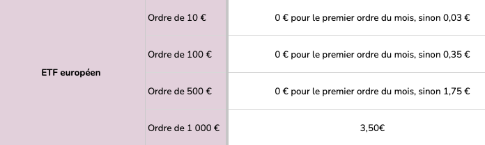 Ça fait maintenant 1 an que je suis chez Fortuneo et j’en suis vraiment satisfait! Niveau frais ça reste bon si on se concentre principalement sur les ETF européens ou les actions françaises. tu restes à 0e de frais pour ton premier ordre du mois (inférieur a 500e) sinon pour le reste, voir photo ci-dessous.