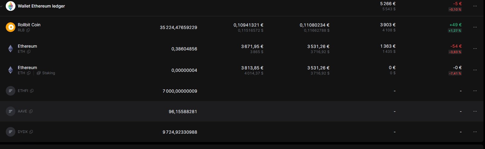 J’ai un soucis dans l’affichage de mes crypto sur finary. hier il y a eu un dip mais ca apparait passer de 200 a 10k sur finary, puis remonter à 143 alors qu’en regardant mes compte binance et ma ledger je suis plutot à 210k. En regardant en detail , plusieurs crypto de ma ledger apparaissent mais ne sont pas valorisées (ethfi, aave , dydx), d’ou l’ecart.