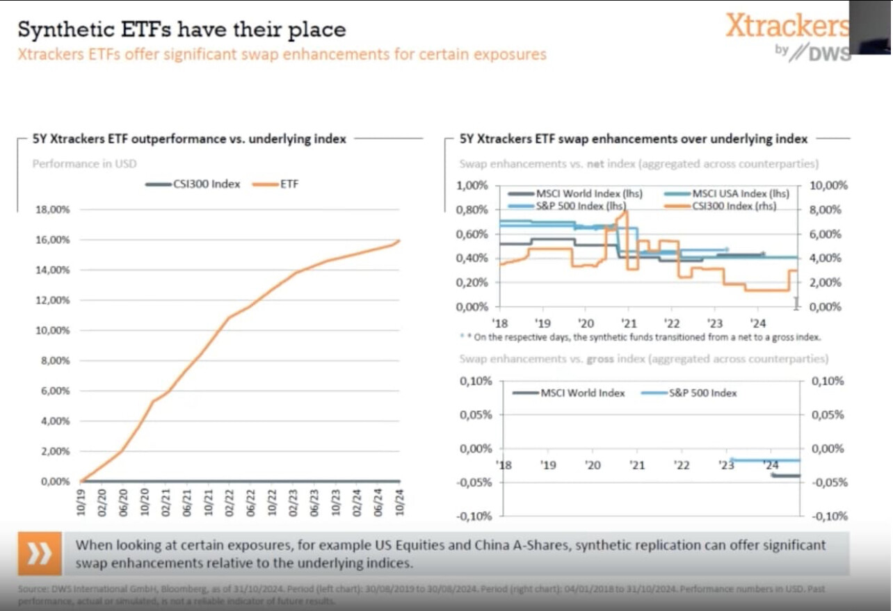 De mon côté, j’ai même souvent une préférence pour les ETF synthétiques vs les ETF physiques, ils bénéficient d’une surperformance structurelle grâce à la section 871(m) de la loi HIRE. Cette disposition exonère certains swaps de retenue à la source sur les dividendes d’actions américaines.