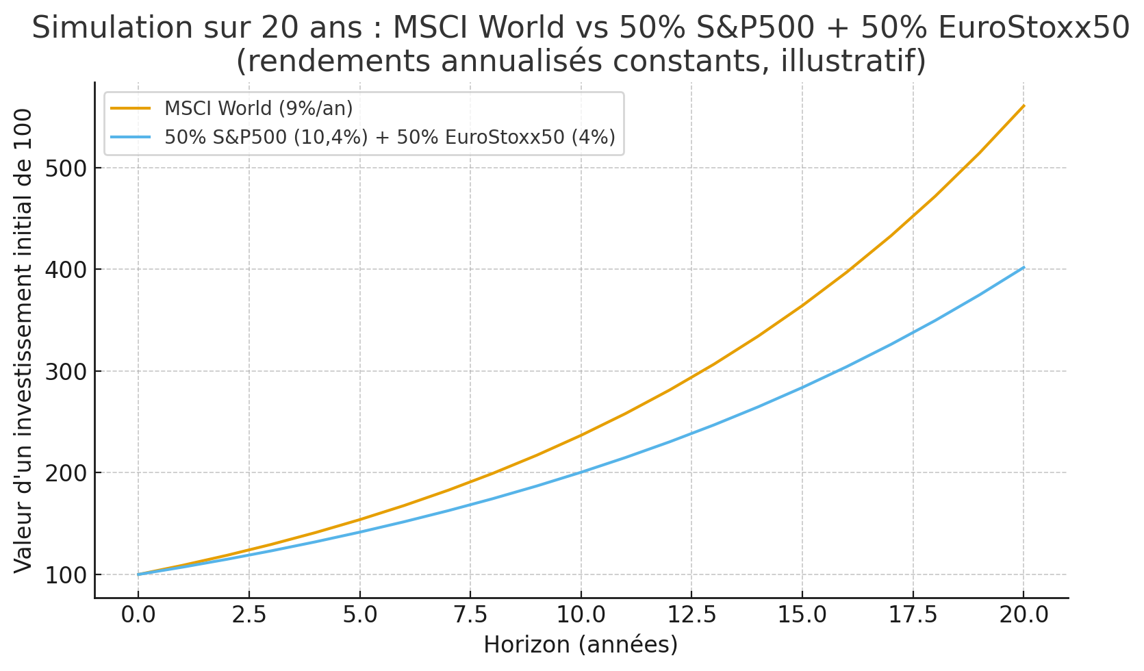 Après tu peux aussi recréer un « MSCI » en prenant du S&P500 + Stoxx600 (éventullement Emerging à dose homéopathique). Mais cette complexification n’est pas nécessaire si tu veux faire du « buy and hold » sur 20 ans.