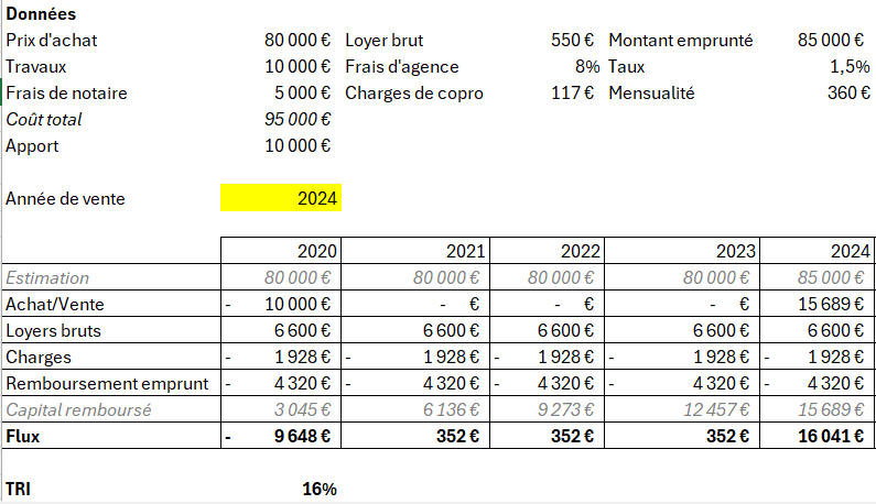 J’ai essayé de faire le tableau de mon côté avec les chiffres que tu as donnés et je trouve un TRI de 16% entre 2020 et 2024. Attention : je n’ai pas fait d’hypothèse sur les travaux à faire (ni sur ton ravalement de façade dont tu n’as pas donné de montant), donc ce TRI est optimiste.