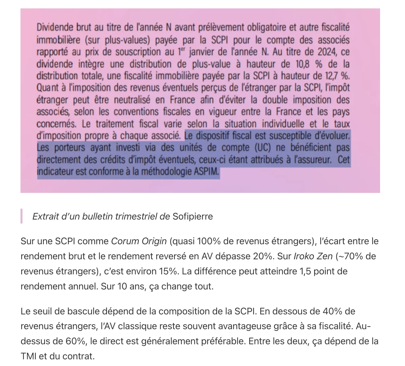 Par contre, lâAV, câest trĂšs intĂ©ressant fiscalement pour les SCPI françaises oĂč tu passes de âmatraquage fiscalâ Ă 100% des loyers tant quâils restent dans lâAV.