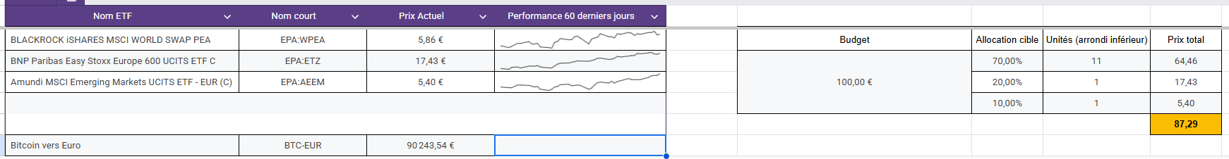 Tu investis uniquement 100€ d’après ton Excel, tu as d’autant plus intérêt à faire une seule ligne sur l’ETF world car tu as des frais sur les autres lignes ce qui représente en réalité beaucoup si ton DCA est de 100€