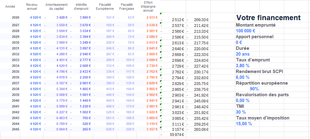 Après tu peux basculer l emprunt SCPI en cash flow positif (sur le papier du moins car les rendements ne sont pas garantis), le premier twist pour ca est de negocier un max de decalage ds le demarrage du remboursement effectif (ca couvre le delai de jouissance voire plus) et ensuite d acheter un % du pret en nu propriete ( en general entre 20 et 25% du montant total sur 5ans de nu propriété - ca peut etre plus). Au moment de la pleine reconstitution tu passes en general cash flow +. Par contre tu auras plus d efforts de remboursement pdt le temps de la nu pro.