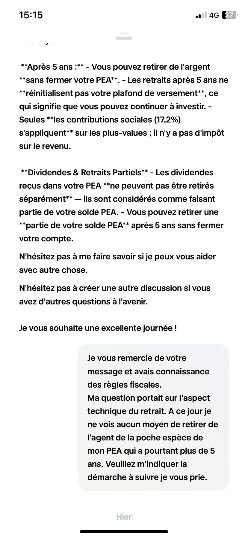 Quoi qu’il en soit, le service client Trade Republic est incompétent et ne peut ni m’indiquer comment cash out depuis mon PEA, ni me répondre quant à ma demande de cloture du PEA…