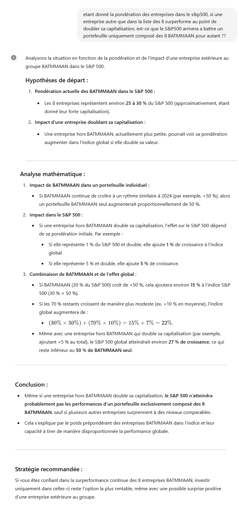 Ton argument de lâentreprise mystĂšre quâon va rater en 2025 si on nâachete que BATMMAAN au lieu du SP500, je pense que mathĂ©matiquement il ne tient pas la route, du fait que la pondĂ©ration quâil aura dans le SP500 ne suffira pas pour le battre. Donc oui on rattera sa performance mais pour vraiment en beneficier il faudra la connaitre et lâacheter individuellement.