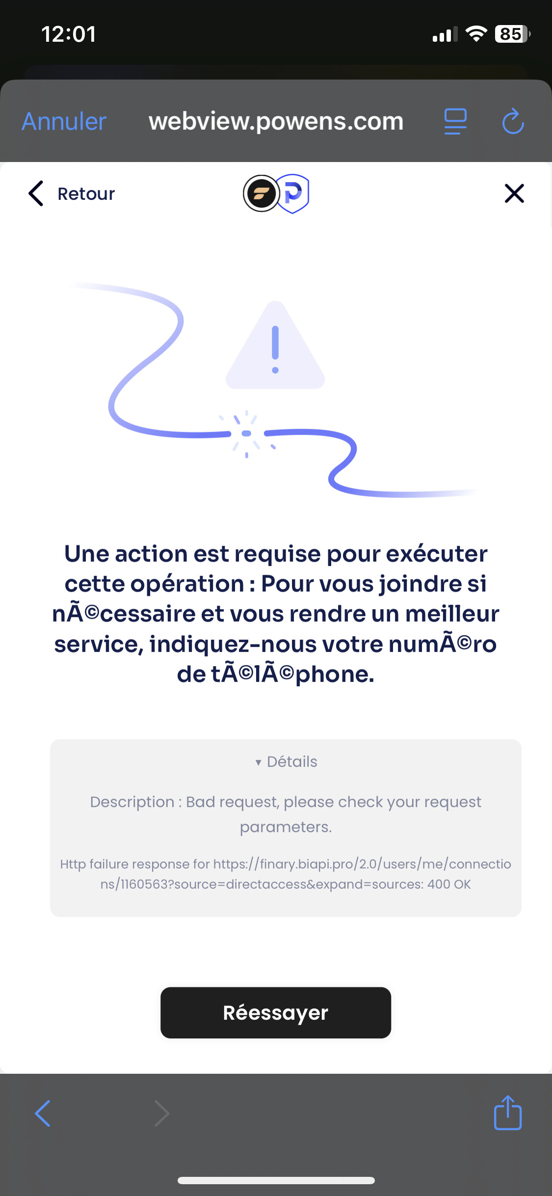 powens est bloqué car il y a une action demandée. Il faut s en debarasser.
