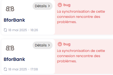 AprĂšs Ă©tude de ce souci concernant BforBank , ils nous informent ne pas pouvoir prioriser la rĂ©solution de ce problĂšme pour lâinstant car il impacte un nombre dâutilisateurs trĂšs faible. Nous leur demanderons de réévaluer la situation si nous recevons dâautres signalements de la part dâutilisateurs dans le futur.