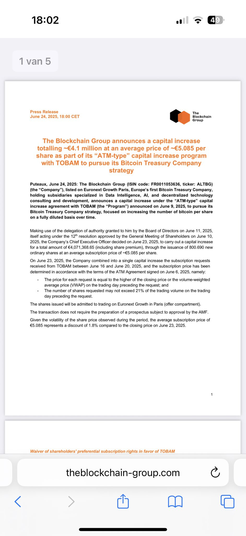 The Blockchain Group annonce lâĂ©mission dâactions et dâobligations convertibles en actions pour un montant total dâenviron 9,7 millions dâeuros afin de poursuivre sa stratĂ©gie de Bitcoin Treasury Company.