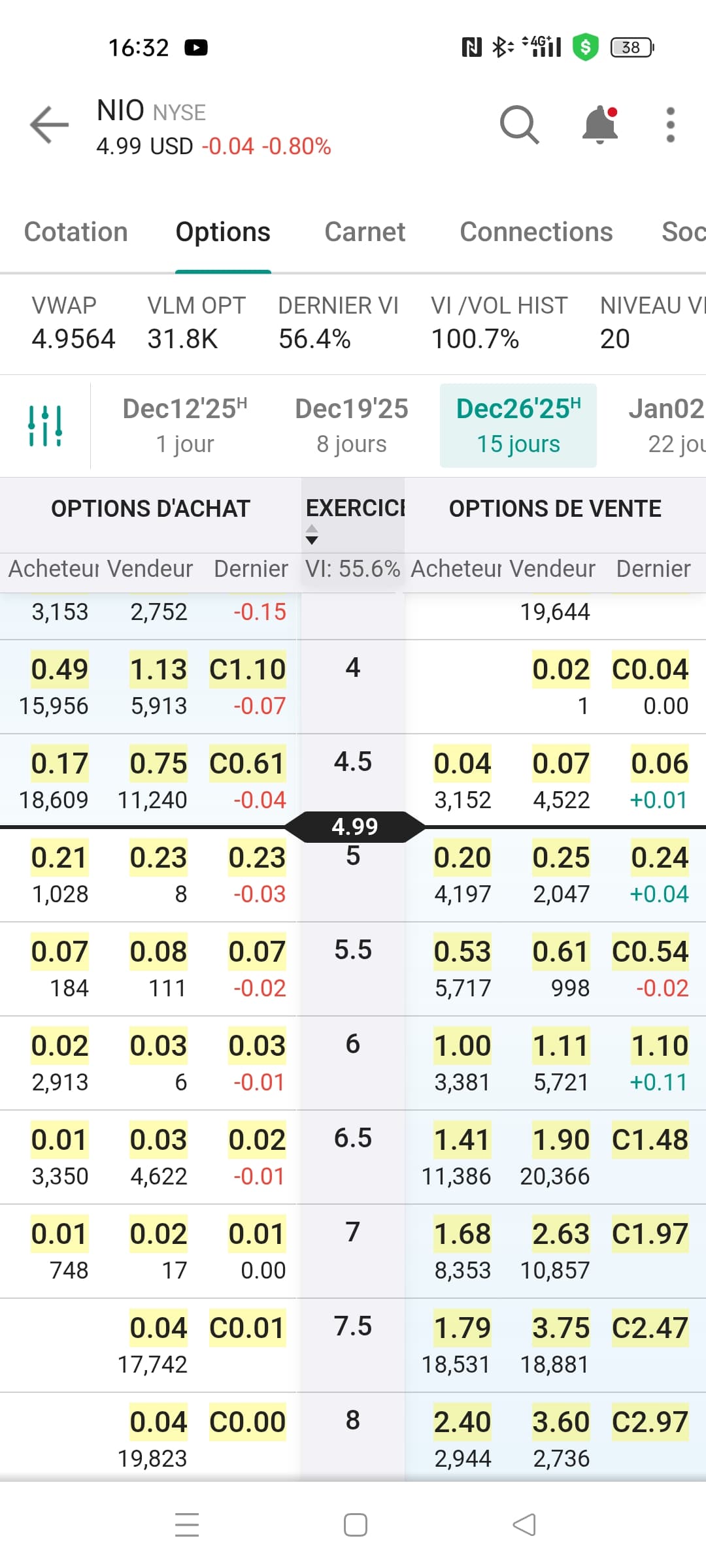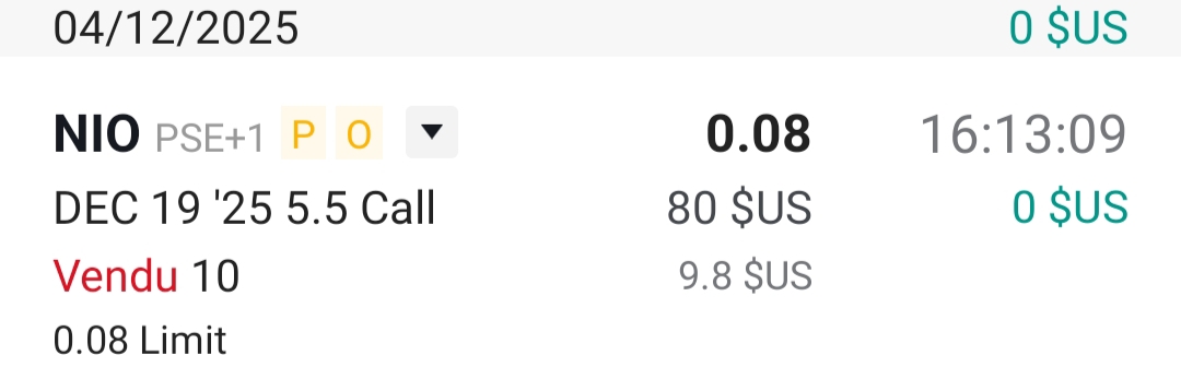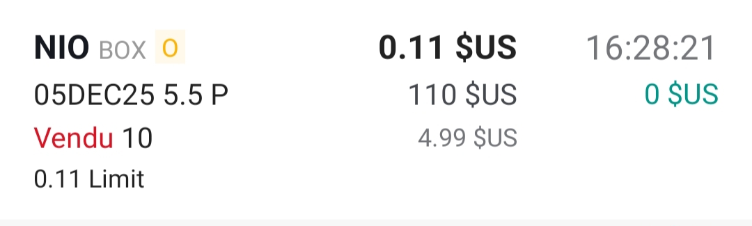 un put sur NIO, jâai encaissĂ© ma prime de 110$ moins 4,99$ de frais, donc 105,01$,au 5/12 Ă 5,5$.