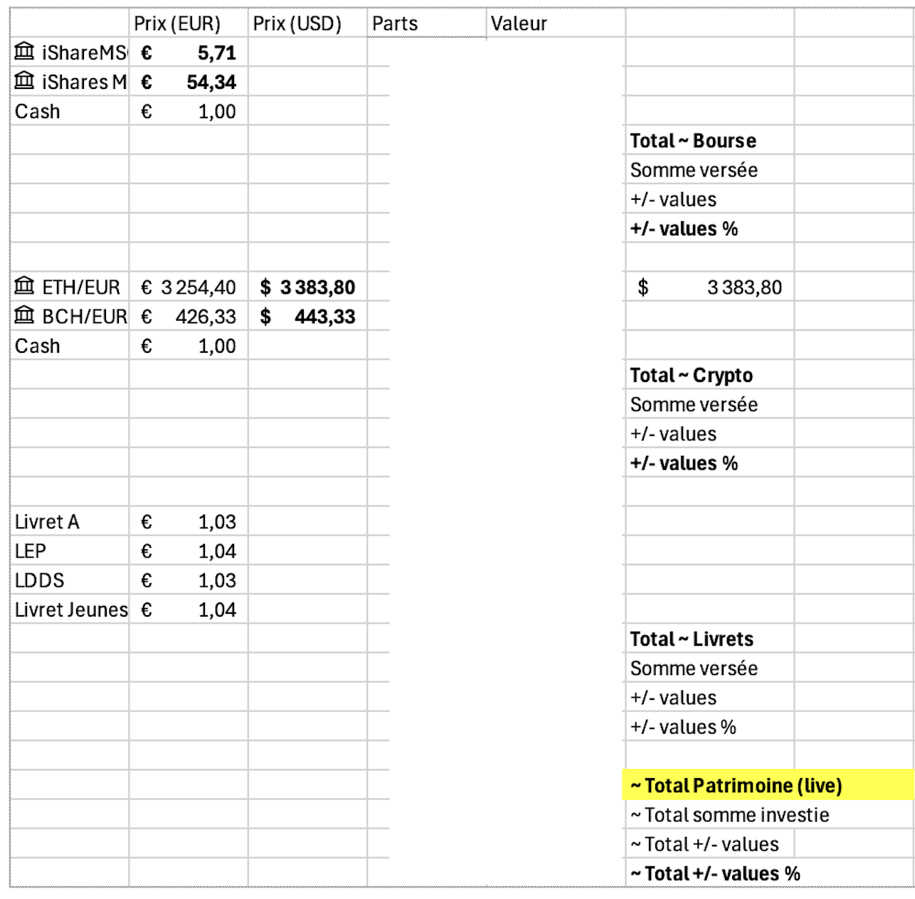 Ce nâest pas la meilleure façon, mais au moins, je rĂ©sous DEUX gros soucis de Finary : lâajout des intĂ©rĂȘts des livrets dans le patrimoine total et le calcul des +/- values de la façon suivante : somme versĂ©e - valeur du portefeuille.