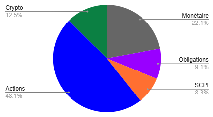 Pour ma part, c’est 60% actions (full ETF sur World et Emergents, juste une action), 20% SCPI, ~16-18% fonds euros et ~3-5% crypto (BTC et ETH)