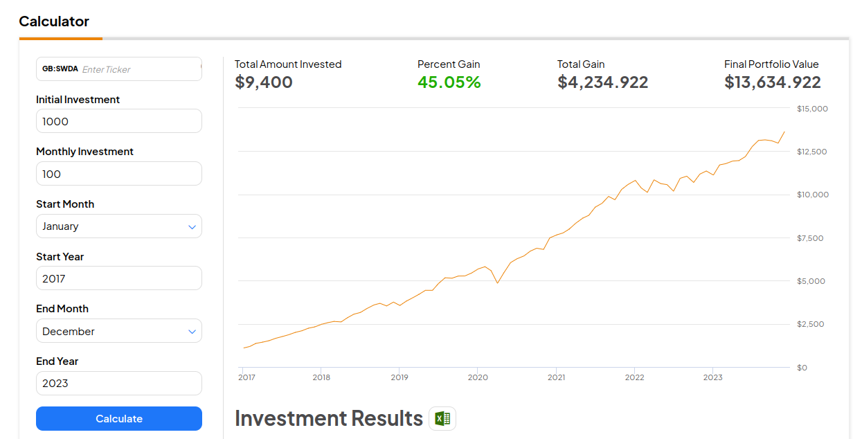Par curiosité, pour simuler, sans market timing, sur un pur DCA en ETF World, on obtient le résultat suivant : +45% sur la même période.